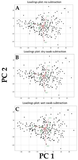 Figure 7 shows the most important wavenumbers responsible for separation along the first 10 PCs for the three pairwise comparisons that were undertaken including: (A) benign control vs. cancer following swab analysis; (B) benign control vs. cancer following swab analysis with the subtraction of dry swab spectra; and (C) benign control vs. cancer following swab analysis with the subtraction of wet swab spectra. The loadings plots demonstrate how strongly a spectral wavenumber influences a PC (see Figure S4). For each comparison, these are remarkably similar. This, again, lends further weight to our hypothesis that a sterile blue rayon swab is an ideal substrate to allow for a dip test in a biofluid such as saliva, which can then be readily and consistently applied to the sensor on the IR spectrometer. This is a critical observation because, if there was a lack of consistency in the background swab spectral signature, this could conceivably introduce a level of variance so great as to increase the difficulty of extracting the features responsible for discriminating between benign control and cancer in this screening approach. The extraction of important biological information, despite the presence of contaminating spectral peaks (e.g., paraffin wax from histological blocks), has been achieved in previous studies [21,22].