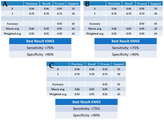 Application of k-nearest neighbours (k-NN) as a machine-learning algorithm. Employing a three nearest neighbours construction, this was undertaken for each of the three pairwise comparisons undertaken: (A) benign vs. cancer following swab analysis; (B) benign vs. cancer following swab analysis with subtraction of dry swab spectra; and (C) benign vs. cancer following swab analysis with subtraction of wet swab spectra.