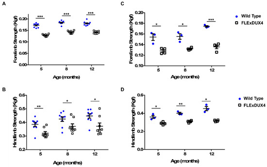 To determine if the FLExDUX4 mice showed muscle weakness, the grip strengths of a cohort of FLExDUX4 mice and their wild-type litter mates (male n = 8–9, female n = 3–4) were measured using an isometric force transducer at 5, 8, and 12 months of age (Figure 1). At all-time points there was a significant difference in the force measurement between the FLExDUX4 and wild-type male (Figure 1A,C) and female mice (Figure 1B,D) (p < 0.05). At 5 months old, male FLExDUX4 mice were an average of 25% weaker in the forelimb (p < 0.001) and 17% weaker in the hindlimb (p < 0.01). At 8 months old, male FLExDUX4 mice were an average of 22% weaker in the forelimb (p < 0.001) and 13% weaker in the hindlimb (p < 0.05). At 12 months old, male FLExDUX4 mice were 21% weaker in the forelimb (p < 0.001) and 17% weaker in the hindlimb (p < 0.05). In female FLExDUX4 mice, the forelimb strength was an average of 18% weaker (p < 0.05), and the hindlimb was an average of 20% weaker at 5 months old (p < 0.05). At 8 months old, female FLExDUX4 mice were an average of 15% weaker in the forelimb (p < 0.05) and 23% weaker in the hindlimb (p < 0.01). At 12 months old, female FLExDUX4 mice were an average of 22% weaker in the forelimb (p < 0.001) and 30% weaker in the hindlimb (p < 0.05).
