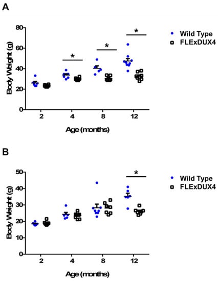 Figure 2. Male FLExDUX4 mice showed body weight differences. (A) Male FLExDUX4 mice showed body weight differences as early as 4 months of age. (B) Female FLExDUX4 mice did not show body weight differences until 12 months of age. * p < 0.05. Error bars are ± the standard error of the mean.