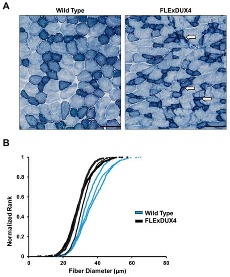 Figure 3. Small and angular-shaped NADH-TR-positive myofibers in quadriceps muscle of 12-month-old male FLExDUX4 mice. (A) Cross-section of quadriceps stained with NADH-TR in wild-type and FLExDUX4 mice. White arrows depict examples of small angular myofibers. (B) S-curve depicting the fiber sizes of NADH-TR-positive fibers of the FLExDUX4 mice and their wild-type littermates, ranked by size. The scale bar marks a 100 µm distance. A total of 586–799 fibers were measured from the same area of the quadriceps muscles in each section (n = 3).