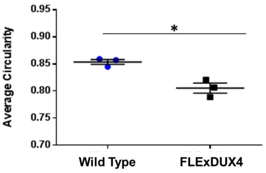 Figure 5. The circularity is reduced in type IIx fibers in FLExDUX4 mice at 12 months of age. Error bars are ± the standard error of the mean. * p < 0.05.
