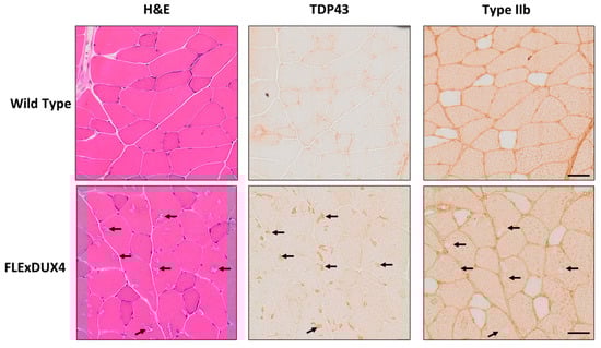 Figure 6. TDP-43-positive aggregates are in type IIb myofibers in quadriceps of 12-month-old male FLExDUX4 mice. Serial sections of 12-month-old FLExDUX4 male quadriceps were taken. Basophilic aggregates in sections stained with hematoxylin and eosin (H&E) were observed in the quadriceps of the FLExDUX4 mice. The TDP-43-positive fibers are also stained positive for the myosin heavy chain type IIb. Black arrows denote examples of aggregates present in the same myofiber. Scale bar measures 50 µm.