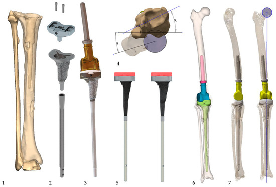 Case number 10, a 71-year-old male patient with a Staphylococcus epidermidis PJI treated in a two-stage exchange. Image 1: perioperative defect. Image 2: tibial assembly with a small modular tibial platform fixed with 2 screws. The interface between the CMS and the tibial platform was augmented with PMMA, and additional screw fixation (e.g., 4 instead of 2) was considered. Image 3: final prosthesis assembly. Image 4: preoperative rotational measurement in a 3D model. Image 5: −5 mm and size-to-size rasps with a trial assembly. Image 6: digital planning of the prosthesis. The rotation was not yet corrected. Image 7: AP and lateral views with axis measurement. Extensor mechanism pilot holes are shown in the proximal CMS.