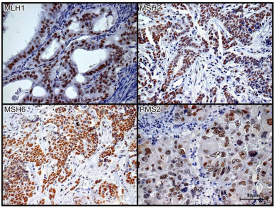 MMR (mismatch repair) corresponds to a family of genes related to functional loss and DNA repair: MLH1 (mutL homolog 1), MSH2 (mutS homolog 2), MSH6 (mutS homolog 6), PMS2 (postmeiotic segregation increased 2) and MLH3 (mutL homolog 3) [21]. Mutations, including inherited or somatic deletions in both alleles of these genes, lead to impaired genomic repair mechanisms during DNA replication in the S phase of the cell cycle. This confers a high propensity for the accumulation of mutations in cells. This genetic failure can be detected by investigating MSI [22]. Microsatellites are small regions of the genome in which nucleotides are sequentially repeated. In these regions, replication errors are more easily recognized because the repetitions favor the occurrence of point mutations as well as small deletions and insertions near the repeat sequences. MSI analysis can be performed either by a polymerase chain reaction (PCR) or indirectly by immunohistochemistry.