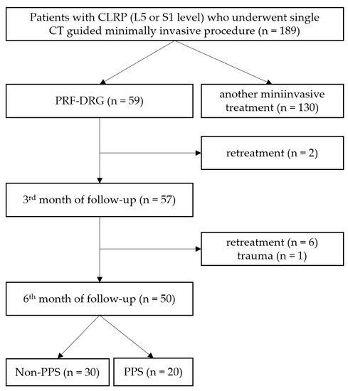 This retrospective monocentric observational study is related to the previously published prospective trial evaluating the effectiveness of the three minimally invasive methods of CLRP treatment (pulsed radiofrequency, oxygen–ozone therapy, and epidural steroid injections) in patients with CLRP [19]. This study was conducted in the Department of Radiology of the University Hospital Hradec Kralove in the Czech Republic. Eligible patients suffered from unilateral CLRP at L5 or S1 level. Each patient enrolled in this study underwent a single PRF–DRG therapeutic intervention and a 6-month post-treatment follow-up. All procedures were performed in the period between 11/2015 and 12/2017.