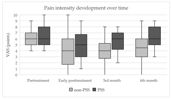 Follow-up in the post-treatment periods showed significant differences in pain reduction (VAS) between the compared groups, in favor of the non-PSS group. The median value of pre-treatment VAS was 6 points in both groups, without significant intergroup differences (p = 0.65). In the non-PSS group, the median VAS decreased from 6 to 4 points immediately after the procedure and remained unchanged until the third post-treatment month. Subsequently, the median VAS increased to 4.5 points in the sixth post-treatment month. The differences between pre- and post-treatment VAS within the non-PSS group proved to be statistically significant at all follow-up time points (all p-values ˂ 0.001). In the PSS group, the median VAS decreased from 6 to 5 points immediately after the procedure and returned to the pre-treatment level (6 points) during the follow-up at both three and six months. The significant difference between pre- and post-treatment VAS values in the PSS group was found for the early post-treatment timepoint only (p < 0.001). Intergroup comparison showed that the post-treatment decrease of the VAS values at both three and six months was significantly more expressed in the non-PSS group (p = 0.0054 and 0.011, respectively). The development of pain intensity over time is shown in Figure 3.