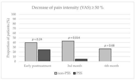 The relative decrease of VAS ≥ 50% within the follow-up time points (immediately after treatment, at three and six months after treatment, respectively) was observed in 12 (40%), 13 (43.3%), and 8 (26.7%) patients in the non-PSS group; alternatively in 5 (25%), 1 (5%) and 0 (0%) patients in the PSS group. The intergroup difference was found significant three months after treatment (p = 0.014) in favor of the non-PSS group (Figure 4).