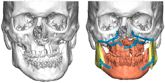 - Suojanen, J.; Leikola, J.; Stoor, P. The use of patient-specific implants in orthognathic surgery: A series of 32 maxillary osteotomy patients. J. Cranio-Maxillofacial Surg. 2016, 44, 1913–1916. [Google Scholar] [CrossRef]