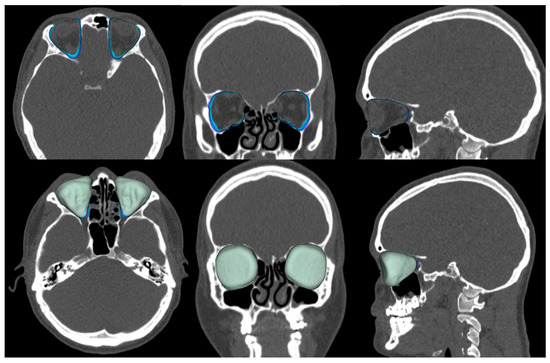 - Chepurnyi, Y.; Chernohorskyi, D.; Prykhodko, D.; Poutala, A.; Kopchak, A. Reliability of orbital volume measurements based on computed tomography segmentation: Validation of different algorithms in orbital trauma patients. J. Cranio-Maxillofacial Surg. 2020, 48, 574–581. [Google Scholar] [CrossRef] [PubMed]