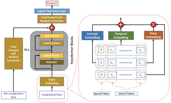 Our design is different from the other existing architectures aforementioned (in Introduction) in several ways. First, our architecture has a hybrid structure allowing for joint learning from both longitudinal and non-longitudinal data. The idea of using a hybrid structure for learning from data containing different modalities (e.g., longitudinal data and non-longitudinal data are two modalities) is not new since it has appeared in many previous studies [25,26,27,28]. However, when limited to the case of using Transformers for clinical data learning, the hybrid structure proposed in this study is new to the best of our knowledge. Second, our architecture can learn from the clinical concepts/codes with numerical values from the longitudinal data. Third, we used a simpler but more natural and more flexible longitudinal data representation and embedding method.