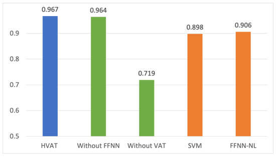 The performance of the model with only the longitudinal data as input (Without FFNN) was very close to that of the HVAT model, while the model with only the non-longitudinal data (Without VAT) was significantly lower. This suggests that the performance of the HVAT model was mainly attributed to the longitudinal data, which in turn shows that the HVAT model had learned relevant patterns from longitudinal data.