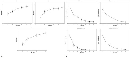 (A) Evolution of sensory block quality in the territories of the C4, C5, and C6 dermatomes; (B) evolution of the motor block quality in the territories of the axillary, suprascapular, subscapular, and lateral pectoral nerves.