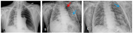 - Weg, J.G.; Anzueto, A.; Balk, R.A.; Wiedemann, H.P.; Pattishall, E.N.; Schork, M.A.; Wagner, L.A. The relation of pneumothorax and other air leaks to mortality in the acute respiratory distress syndrome. N. Engl. J. Med. 1998, 338, 341–346. [Google Scholar] [CrossRef] [PubMed]
