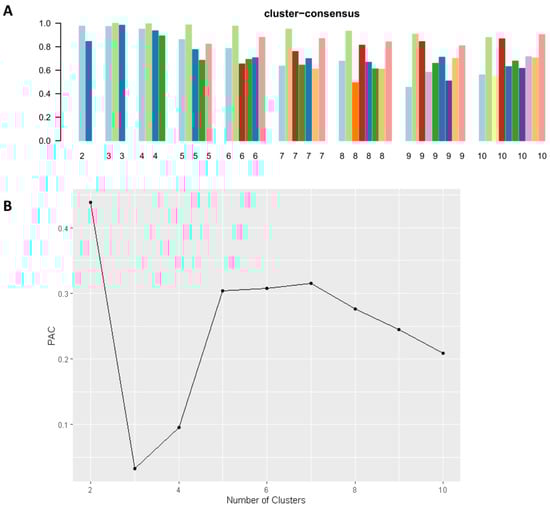 Key findings from the analysis. In (A), the bar plot showcases the average consensus score across different numbers of clusters (k ranging from two to ten). Different color columns indicate different cluster groups. Additionally, (B) presents the assessment of ambiguously clustered pairs using PAC values.