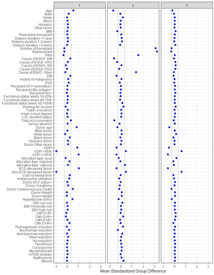 There were 2903 (37%) patients in cluster 1, 1687 (9%) patients in cluster 2, and 4286 (54%) patients in cluster 3. Table 1 shows recipient-, donor-, and transplant-related characteristics of diabetic donor kidney transplant recipients according to the assigned clusters. According to standardized mean differences, shown in Figure 3, cluster 1 recipients were older in age (mean age 64 years) first-time kidney transplant recipients (99%). Kidney allografts in cluster 1 were more likely to come from older (mean age 45 years) hypertensive (89%) donors who met ECD criteria (78%). Cluster 1 donors were more likely to have a cerebrovascular cause of death (63%) and a high KDPI (77% had KDPI ≥ 85%). Recipients in cluster 1 were more likely to be diabetic compared to cluster 2 and 3 (55% vs. 21% and 38%, respectively). Cluster 2 recipients were younger (mean age 49 years) re-transplants (100%) with higher panel reactive antibodies (PRA) (median 88). Cluster 2 recipients received kidneys from younger (mean age 44 years), non-ECD (12%) donors with low number of HLA mismatch (median 4). Cluster 3 recipients were first-time kidney transplant patients who received kidneys from younger (mean age 42 years) non-ECD (98%) diabetic donors with lower KDPI (3% had KDPI ≥ 85%).