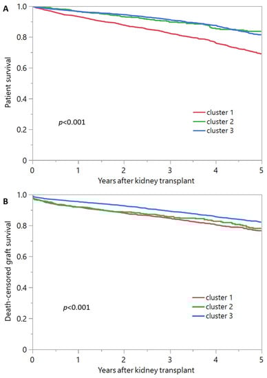 Outcomes of patient survival (A) and death-censored graft survival (B) specifically for the three distinct clusters of kidney transplant recipients from deceased donors with diabetes.