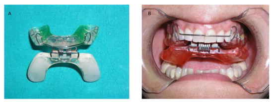 The two plates are connected by a front hinge positioned at the level of the incisor part, and the two vestibular springs positioned on the left and right sides connect at the level of the canine-premolar region (Figure 1). This device structure is able to obtain an improved lower plate elastic strength during functional movements and mouth closure. The springs used can have hard or soft strength depending on the patient’s individual characteristics. The functional action is obtained through a push mechanism at the level of the posterior region of the mandible arch. It can induce a downward and forward movement of the mandible condyle process. In addition, the device aims to enable recovery of the correct functional and anatomical relationship between the articular disc and mandible condyle process, while in the case of a more severe clinical condition and a non-predictable complete recovery, the device aims to provide jaw function rehabilitation and a significant reduction of acute pain. The clinical protocol was conducted by instructing the patients to wear the device for 2 h during the daytime and during the night, with periodic follow-up appointments. Daytime therapy use is dedicated to active exercises and gymnastic where patient does opening and contra-lateral movements in order to improve the functional recovery of the affected side [21]. No additional drug or manual treatment was applied for either of the groups.
