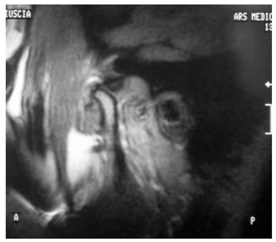 Closed lock is acute when the onset is abrupt and persists for no more than 20–30 days; sporadic when the patient reports only a few episodes over a very long period of time, i.e., no more than three episodes in 1 year; recurrent when the patient reports episodes occurring with a certain frequency; intermittent when the patient reports daily episodes; and chronic when hypomobility has been continuous for more than 30 days. It can be distinguished as “permanent” when it is subsequent to an acute episode without symptom remission or “terminal” when it derives from recurrent or intermittent manifestations [7]. Disc displacement can be diagnosed by clinical investigation and imaging methods. The recent improvement of diagnostic imaging has significantly increased the possibility of a better understanding of temporomandibular dysfunctions (TMDs) [8]. Magnetic resonance imaging (MRI) of the TMJ can provide indispensable information about the position [9], signal intensity [10], morphology and structure of the disc [11], quantity of the synovial fluid [12], condition of the bone [13], posterior attachment and retrodiscal tissues [14], bone marrow [15], and scar tissues [16]. Furthermore, MRI analyzes the relationships between joint structures, and, above all, it is the only method that can give information about the position of the joint disc. These MRI characteristics are essential for diagnosis and treatment planning.