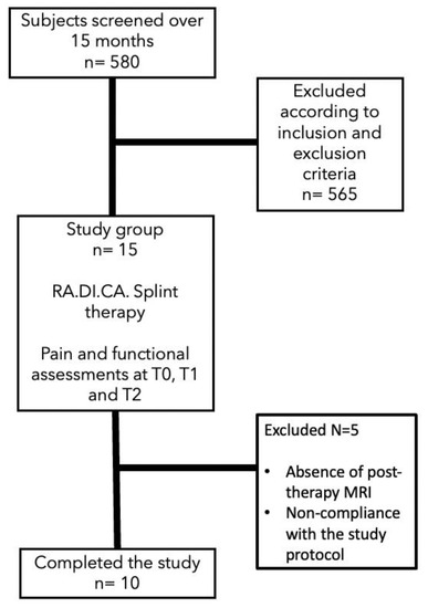 Therefore, MRI should be used for pre- and post-treatment assessments of the biomechanical aspects of joint structures. From a functional point of view, a more objective recording of clinical data can be achieved by electrognathography, which evaluates both antero-posterior and lateral mandibular movement, measuring the mandibular opening, the lateral deviation, the spontaneous movement, and the relaxing habitual position of the mandible. It is mainly used for the objective analysis of the mandibular movements [17]. Several kinds of treatment protocols have been proposed for its resolution, such as physiotherapy, drugs, occlusal splints, and surgical options [5,18,19]. Regardless of the method used to solve the joint lock, the immediate treatment aims at recapturing the articular disc. If that is not possible, treatments should be targeted at improving mandibular function and remodeling the soft tissues of the temporomandibular joint [20]. Among the conservative splint therapies, the patented RA.DI.CA. splint (acronym for Rampello–Di Paolo-Cascone License No. 91-000571) is able to diminish acute painful symptoms in favor of a specific orthopedic rehabilitation. As stated in previous studies [21,22], the major effectiveness of the RA.DI.CA splint compared to other ones is due to greater distraction and orthopedic action, with the aim of mobilizing temporomandibular joints, through a downward and forward movement of the mandibular condyles, which also allows for the restoration of muscular functionality. Recent studies describe a detailed DDwoR protocol combined with pharmacological and physical treatments customized considering the individual characteristics of the subject [21]. Previous studies investigated its clinical effectiveness and compared it with other occlusal devices [22]. In the scientific literature, as for the goals of mandibular joint locking therapy, the need for disc recapturing is still debated in terms of functionality and symptom improvement. Furthermore, most of the splints used for DDwoR treatment have a passive action of stabilization without joint mobilizing or disc recapturing. The hypothesis of this study is to verify if joint disc recapturing is possible through a RA.DI.CA splint and identify the possible clinical implications of this treatment.
