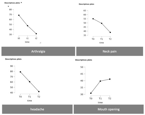 Statistically significant differences over time for both arthralgia (p < 0.001) and headache (p < 0.001) were reported. Neck pain was reported to have a significant difference considering the follow-up periods with comparisons T0–T2 (p < 0.001) and T1–T2 (p < 0.001). The same evidence was also reported considering the mouth opening at the timepoints comparisons T0–T1 (p < 0.001) and T0–T2 (p < 0.001) (Figure 7 and Table 3).