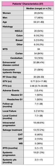 The most frequent primary histologies were NSCLC, colorectal cancer, and breast cancer, respectively, in 54%, 13.6%, and 16.2% of cases. Concurrent systemic therapy was administered in 56% of patients. The majority of the treated lesions were supratentorial (84%), and cerebellar in the remaining 16%. The median GTV was 0.77 cc (0.3–17.86 cc), and median PTV was 2.66 cc (0.74–30.69 cc). The patients’ characteristics are summarized in Figure 1.