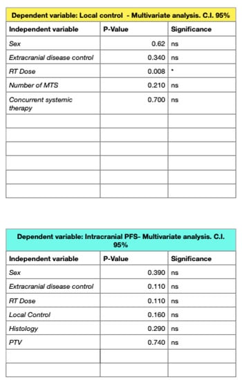 Concerning LC rates, the authors addressed the suboptimal result of the presence of radioresistant histologies in their series, such as melanoma, overrepresented in comparison to other primary tumors, such as breast cancer.