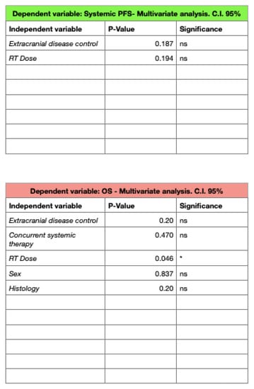 The baseline characteristics of the patients were collected using descriptive statistics. Survival estimates were performed with the Kaplan–Meier method. Cox regression was applied for the uni- and multi-variate analyses, which were performed assuming a p-value of ≤0.05 as statistically significant, including for multivariate analysis p-values of <0.15. All the statistical analyses were carried out using the software Graphpad Prism V9.4.1 (Graphpad, San Diego, CA, USA).