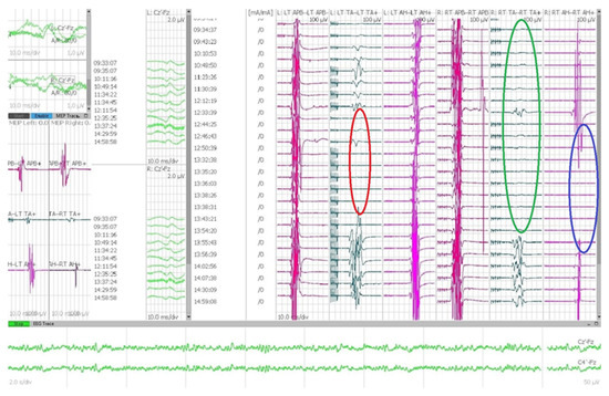 Example of IONM in a case of thoracic meningioma: red circle shows a temporary disappearance of muscular response from left tibialis anterior; green circle shows absence at baseline acquisition of the right tibialis anterior muscular response, followed by an intraoperative recovery; blue circle outlines a temporary drop in MEP from the right abductor halluces.