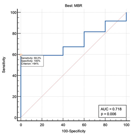 A trend of correlation was found between MMS at 1 year and best MBR (p = 0.0946, Mann–Whitney U test). No other correlations were found between MMS at 1 year and MEP amplitude ratios. In ROC analysis, best MBR was able to sub optimally predict final outcome, with an AUC of 0.718 and a best cut-off set at 94% (Figure 2). However, by adopting this cut-off, we found that all patients with best MBR >94% had a good long-term outcome vs. 80.2% of patients with best MBR < 94% (p = 0.0208, Fisher exact test; Figure 3). No MEP amplitude ratio was able to predict clinical MMS variations at the end of follow-up compared with preoperative baseline.