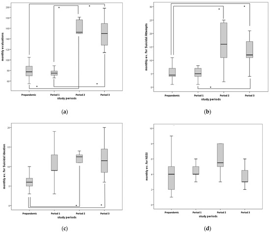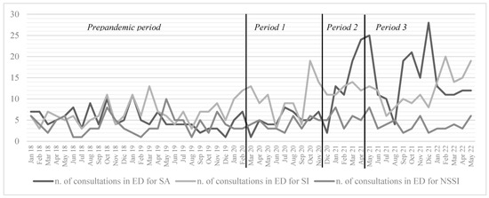 - Apicella, M.; Serra, G.; Trasolini, M.; Andracchio, E.; Chieppa, F.; Averna, R.; Iannoni, M.E.; Infranzi, A.; Moro, M.; Guidetti, C.; et al. Urgent psychiatric consultations for suicide attempt and suicidal ideation before and after the COVID-19 pandemic in an Italian pediatric emergency setting. Front. Psychiatry 2023, 14, 1135218. [Google Scholar] [CrossRef]