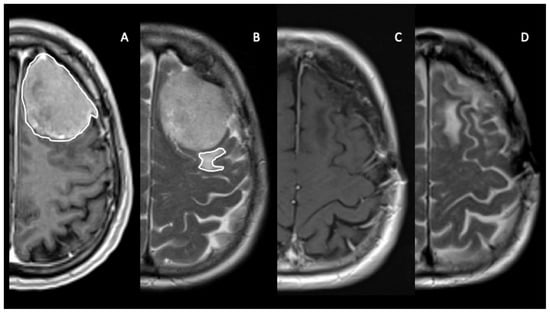 A brain MRI of a patient with left frontal meningioma. (A,B) show pre-operative postcontrast T1-weighted (A) and T2-weighted TSE MRI sequences, demonstrating ROI segmentation of lesion and peritumor edema, circumferentially outlined, using Horos software. (C,D) display postcontrast T1-weighted and T2-weighted TSE MRI sequences after surgical resection.