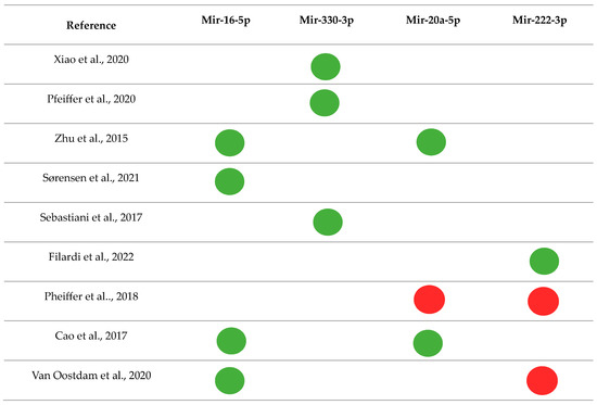 Main miRNAs and their regulations were found in the systematic review [28,39,40,47,50,51,62,68,70,72].