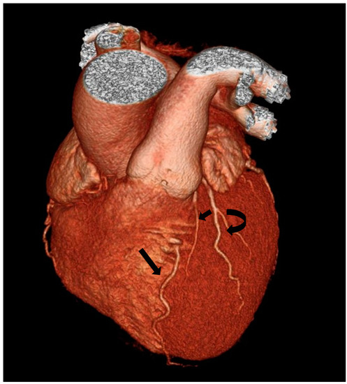 - Agarwal, P.P.; Kazerooni, E.A. Dual left anterior descending coronary artery: CT findings. AJR Am. J. Roentgenol. 2008, 191, 1698–1701. [Google Scholar] [CrossRef]
