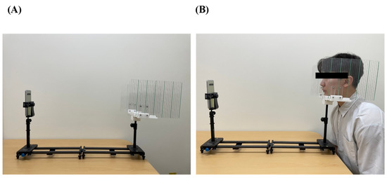 Composition of the evaluation frame. (A) The frame was composed of a chin rest on one side and phone holder on the other. The distance was fixed with a bar. On the side with the chin rest, markings were placed bilaterally to confirm a neutral position. (B) The heights of the chin rest and phone holder could each be individually adjusted for the patient.