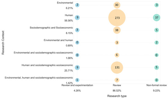 Bubble chart mapping and associating the type of research with the research context. Percentages are calculated for each axis.
