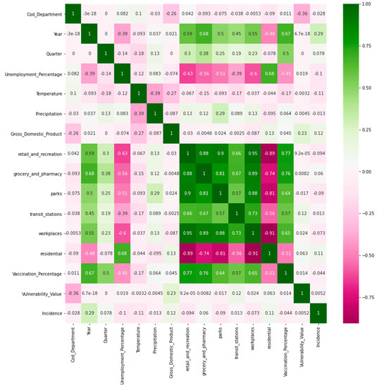 In the confusion matrix in Figure 3, the green color indicates a high positive correlation between variables, the fuchsia color indicates a high negative correlation, and the white color indicates a low correlation. For example, Figure 3 shows that variables such as GDP and “residential” (mobility) are positively correlated, while temperature and “retail_and_recreation” are negatively correlated. In addition, it is important to mention that the incidence column is the output variable. Figure 4 presents the confusion matrix for Spearman’s correlation.