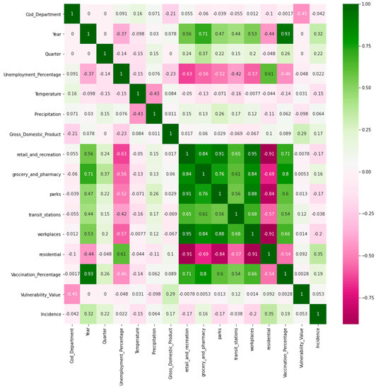 In Figure 4 (similar to Figure 3) the last column shows some shades of green and some fuchsia, indicating these variables have a positive correlation (green) or negative (fuchsia). The high intensity of the green color shows a high correlation. In Figure 4, variables such as GDP, “residential”, “grocery and pharmacy”, and vaccination percentage have a positive correlation with the incidence variable. At the same time, the variables temperature and “workplaces” (mobility) have a negative correlation. In addition, variables such as precipitation and percentage of unemployment show a fairly low correlation with incidence.