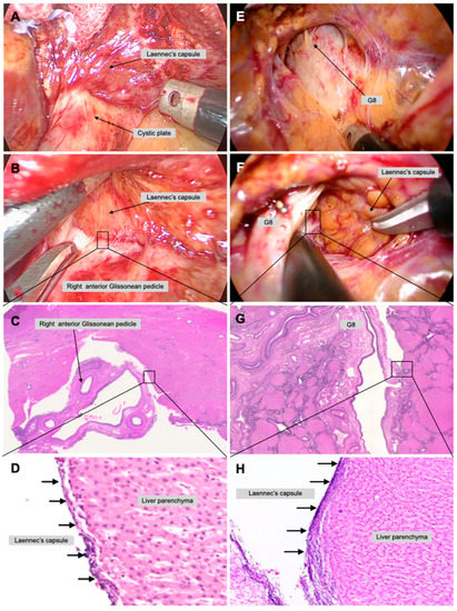 Laparoscopic second and third branches of the Glissonean pedicle isolation in a live body. Right anterior Glissonean pedicle isolation was performed in laparoscopic right hepatectomy to validate the appropriate layer to be dissected. The space between the cystic plate and the Laennec’s capsule was dissected to expose the Laennec’s capsule (A). The dissection in the same layer as the cystic plate cholecystectomy was continued to the ventral side of the right anterior Glissonean pedicle (B). The Laennec’s capsule on the liver parenchyma and exfoliated right anterior Glissonean pedicle of a live body is shown in low- (C) and high-power fields (black arrows) (D). Glissonean pedicle 8 isolation was performed during a laparoscopic segmentectomy 8. Blunt dissection between the right anterior Glissonean pedicle and the Laennec’s capsule in the direction of the peripheral Glissonean pedicle allowed identification of the Glissonean pedicle 8 (G8) and Glissonean pedicle 5 (G5) (E). The dissection was performed while looking directly at the dorsal aspect of G8 using the laparoscopic magnification effect (F). The Laennec’s capsule on the liver parenchyma and exfoliated G8 is shown in low- (G) and high-power fields (black arrows) (H).