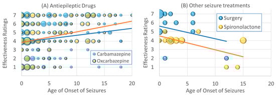 The effectiveness of surgery [χ2(1) = 29.61, p ≤ 0.001; β = −0.37] decreased with the age of seizure onset. As seen in Figure 2B, surgery was rated as very effective in those with seizures which started in infancy and younger childhood. The effectiveness of spironolactone decreased with the age of onset of the seizures [χ2(1) = 20.68, p ≤ 0.001; β = −0.41]. As seen in Figure 2B, for those with seizures that started in early childhood, spironolactone was rated as having no effect, while those with seizures that started in adolescence, spironolactone appeared to have a negative effect.