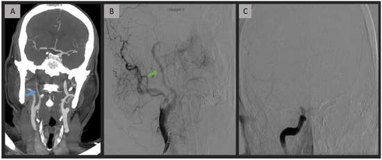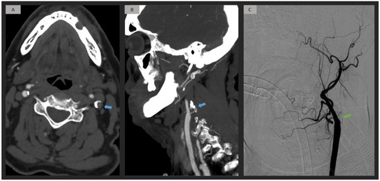 Patient with left origin ICA occlusion attributed to an atherosclerotic plaque. Axial and sagittal CTA images (A,B) exhibit a well-delimited occlusion at the origin of the ICA, resulting from an atherosclerotic plaque with calcifications (blue arrow). DSA confirms the occlusion of the ICA from its origin (green arrow). (C). ICA = internal carotid artery; CTA = computed tomography angiography; DSA = digital subtraction angiography.