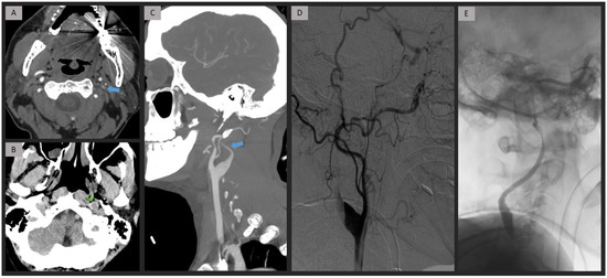 Patient presenting with left extracranial ICA occlusion caused by dissection. Axial and Sagittal-MIP CTA images (A,C) demonstrate a progressive contrast decay and stenosis of the cervical ICA, associated with an arterial widening (blue arrow). NCCT (B) reveals a wall hematoma in the left ICA near the skull base (green arrowhead). DSA (D) and fluoroscopy (E) confirm the diagnosis of cervical ICA dissection. ICA = internal carotid artery; NCCT = non-contrast computed tomography; MIP = maximum intensity projection; CTA = computed tomography angiography; DSA = digital subtraction angiography.