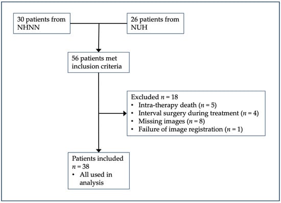 Consecutive patients (n = 56) who received MATRix chemotherapy at two different treatment centres, the National Hospital of Neurology and Neurosurgery, University College London Hospitals NHS Foundation Trust (NHNN, n = 30), and Nottingham University Hospital (NUH, n = 26), were eligible for the analysis. Inclusion criteria comprised the following: age over 18 years, histological confirmation of primary DLBCL of the CNS as defined by the World Health Organisation Classification of CNS Tumours [16,17], treatment with MATRix chemotherapy, no evidence of systemic Non-Hodgkin Lymphoma, serology-negative for human immunodeficiency virus and available contrast-enhanced and diffusion-weighted imaging (DWI and ADC) at baseline, after 2 cycles of treatment and within one month of completion of MATRix treatment. Ethics review board approval (Health Research Authority, United Kingdom, IRAS 218180) was obtained with informed consent waived for this retrospective imaging data study. Exclusion criteria were intra-therapy death, leading to non-completion of treatment and, therefore, unavailable imaging at the treatment completion timepoint (n = 5), interval surgery during treatment (n = 4), missing images (n = 8) and failure of registration of ADC map to post-contrast T1-weighted imaging (n = 1). Of the 56 patients who met the inclusion criteria, 18 patients were excluded. A diagram of the patient selection process is shown in Figure 1.