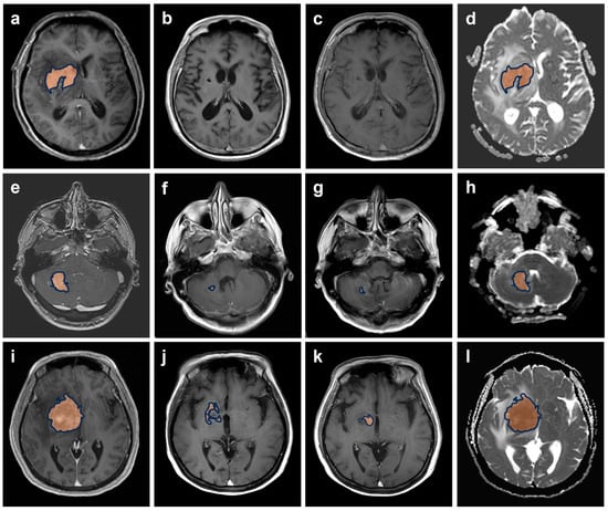 An example of the response groups defined for statistical analysis. T1CE-weighted images with manually segmented tumours before treatment (first column) and after completion of 2 and 4 cycles of MATRix immunotherapy (second and third columns, respectively) in a patient with complete response (Group 0, (a–c)), a patient with partial response (Group 1, (e–g)) and a patient with lack of response and with appearance of a new lymphoma deposit from 2 to 4 cycles of treatment (Group 2, (i–k)). Corresponding ADC images at baseline are shown for each example (Group 0, (d); Group 1, (h); Group 2, (l)).