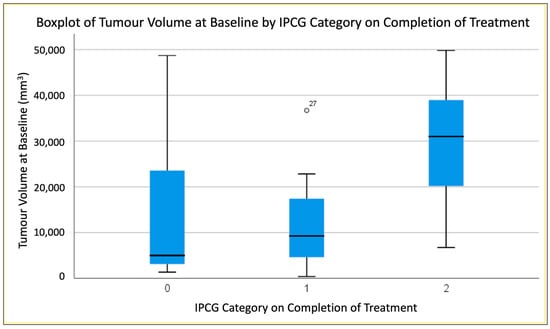 T1CE tumour volume at baseline significantly differed amongst response groups 0, 1 and 2 (Figure 3). ANOVA testing showed that Group 2 had statistically significant larger tumour volumes at baseline compared to Group 0 (p < 0.020) and compared to Group 1 (p < 0.014). There was no significant difference in baseline tumour volume between Group 0 and Group 1. In one patient, T1 shortening due to macroscopic haemorrhage was present at baseline, but no pre-contrast axial imaging was available for segmentation. Therefore, both pre- and post-contrast segmentations were performed on coronal T1 sequences to optimise volume of interest placements. The pre-contrast segmentations were then subtracted from the post-contrast segmentations to remove haemorrhage from the tumour, enhancing volume calculation.