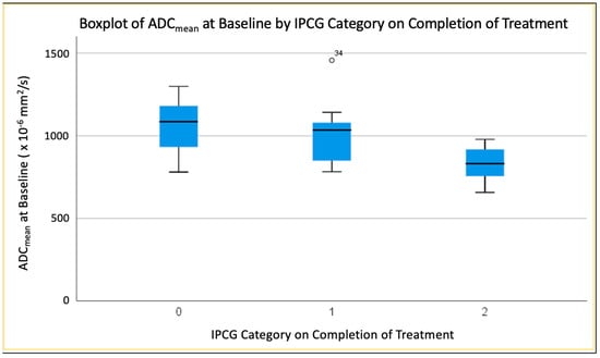 The most strongly significant difference was in ADCmean at baseline between complete response (0) and progressive disease (2) groups (p < 0.005) (Figure 5). There was also a significant difference in ADCmean at baseline between partial response (1) and progressive disease (2) groups (p < 0.038). There was no significant difference in this parameter between complete response and partial response groups (p < 0.410).