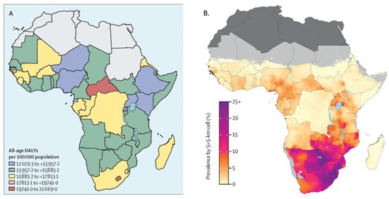 Disease burden in Southern Africa. (A) Non-communicable disease burden (reproduced with permission from [7]) and (B) HIV prevalence (reproduced with permission from [9]) in Africa in 2017.