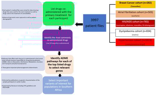 For each cohort, the variables assessed included the drugs prescribed and the comorbidities recorded. Figure 2 shows the workflow of how both pharmacogenes and their variants relevant to Southern African populations were selected. Briefly, to identify the most frequent pharmacogenes relevant to the Southern African patient cohort, all drugs taken by each patient were counted. The top 20 drugs based on prescription frequency were then selected. To select pharmacogenes, we scouted the literature for the pharmacology of each drug and identified proteins, both transporters and enzymes, involved in the response to each drug. PharmGKB (www.pharmgkb.org accessed on 1 November 2022) [11] was used to confirm the listed genes associated with the response to each drug via the pharmacokinetic and pharmacodynamic pathways available in the PharmGKB database. Subsequently, each protein/enzyme involved in the response to the top drugs was noted. Pharmacogenetic variants per gene were subsequently selected based on both prior data from our research group (Table 1) and/or the literature and compared amongst global populations.