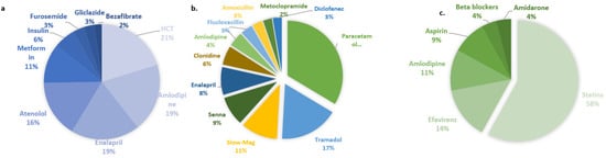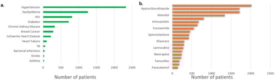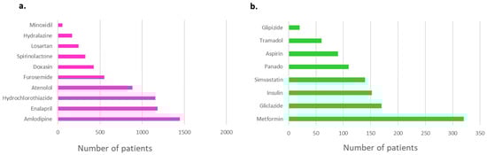 (a) Prescribed anti-hypertensives (n = 1613) and (b) co-prescribed medications (n = 388) of patients in the hypertension cohort. Of the 1613 patients in the hypertensive cohort, only 388 had recorded co-prescriptions, as shown in (b).