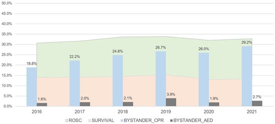 Graph showing the trends of bystander intervention and clinical outcomes of out-of-hospital cardiac arrests that occurred in public places from 2016 to 2021.